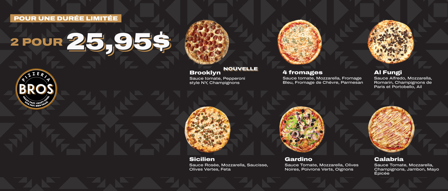 Nous avons quelque chose sur notre menu qui plaira à tous ! Si vous préférez essayer autre chose qu’une pizza, optez plutôt pour l’un de nos sandwichs ou l’une de nos salades fraîches ! Nous avons également des options végétaliennes et des choix en cas de sensibilité au gluten, afin que chacun puisse profiter de Pizzeria Bros !