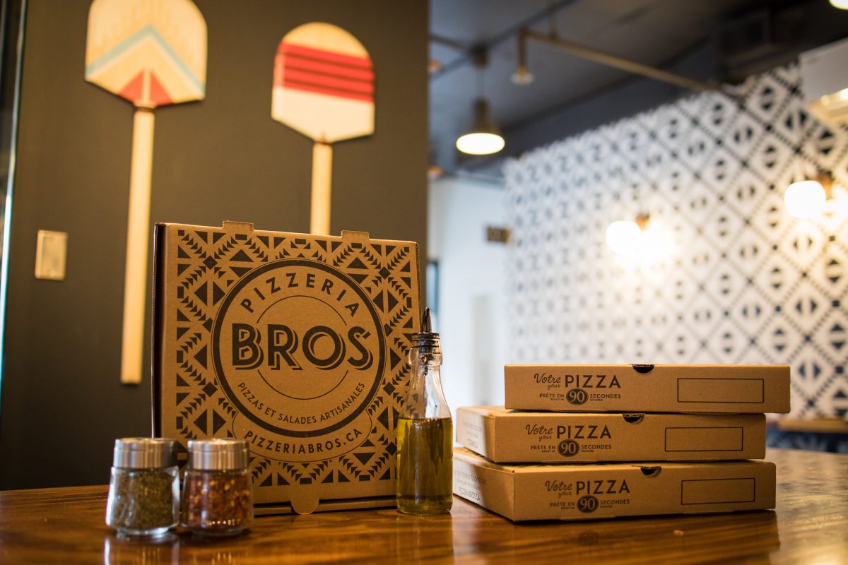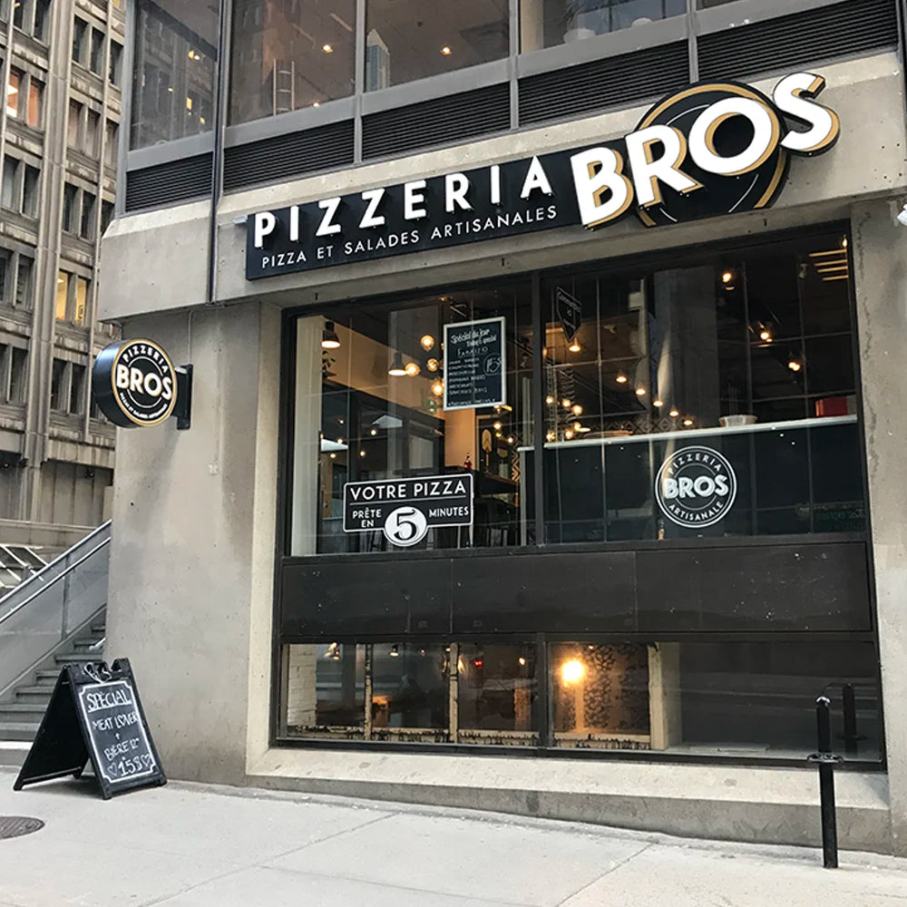 Pizzeria Bros a ouvert ses portes dans le Vieux-Montréal en 2016. La catégorie la plus importante au menu, la pizza à croûte mince, est préparée avec des ingrédients de haute qualité dans une atmosphère de service rapide.
